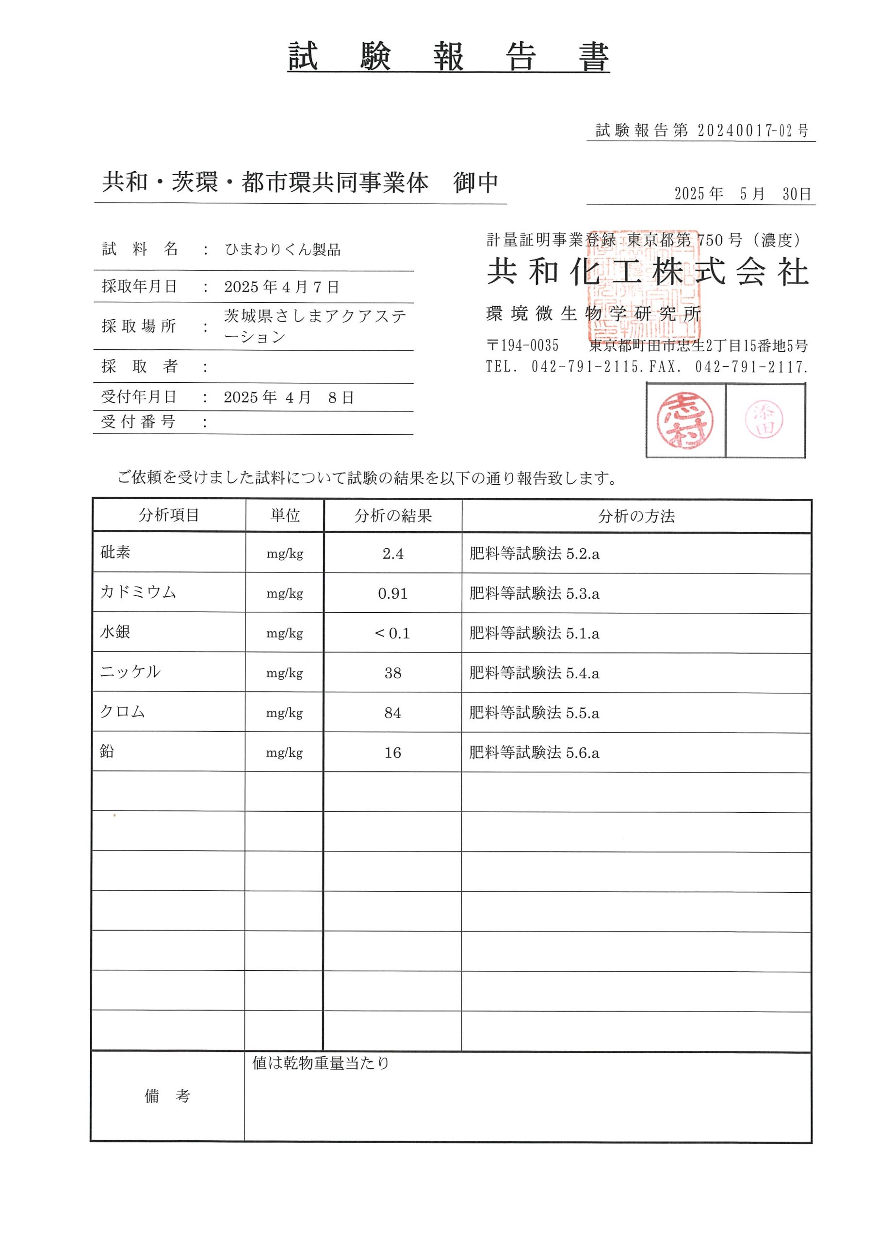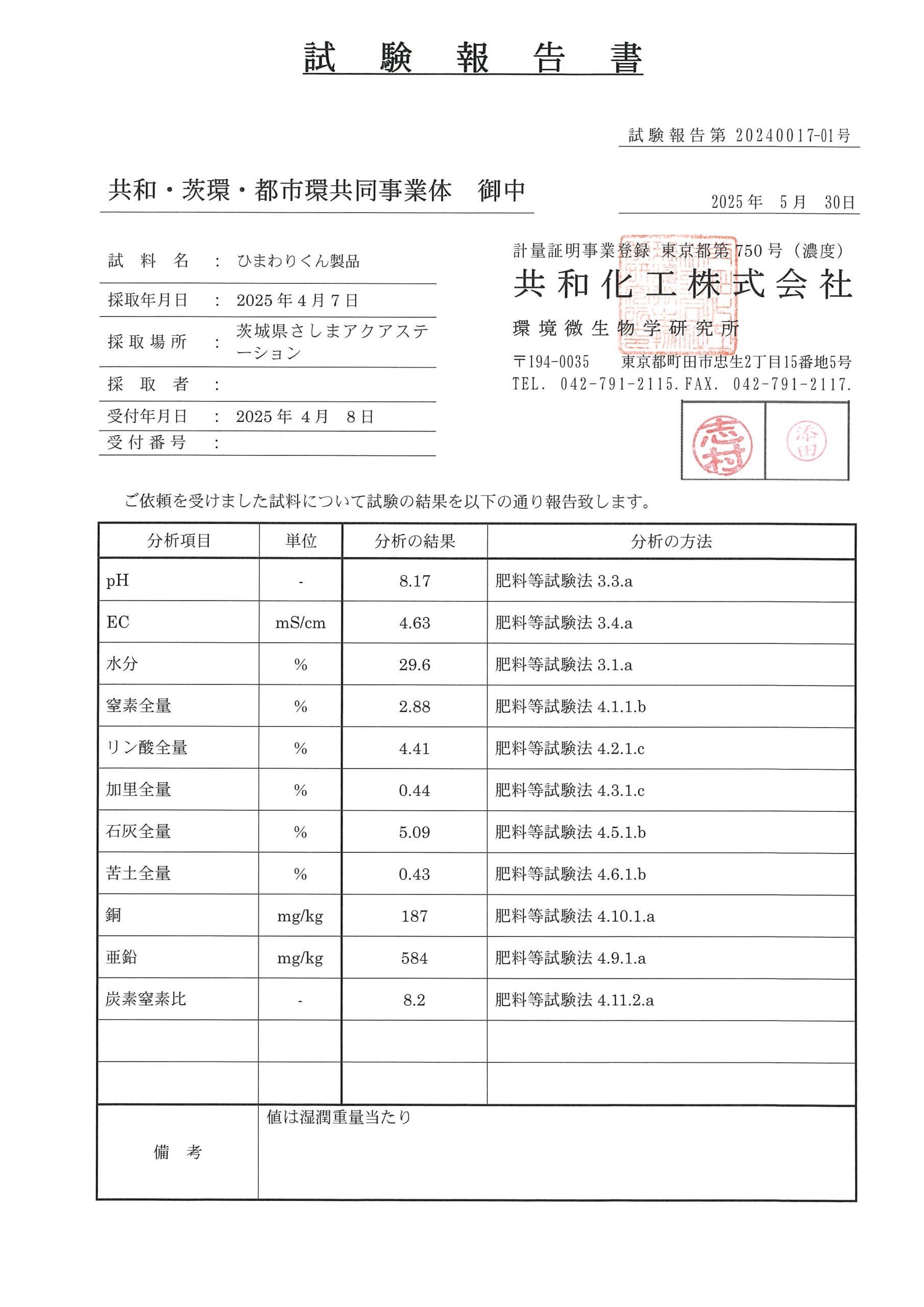 環境微生物研究所にて2025年4月7日に採取した茨城県さしまアクアステーションの肥料の分析を行いました。